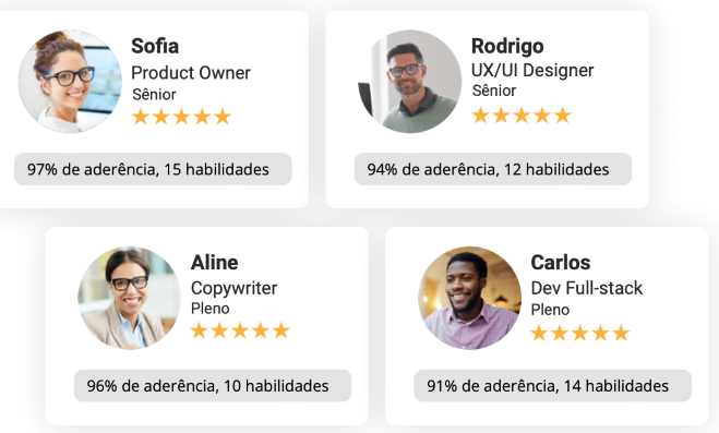 Porém usamos nossa plataforma com tecnologia de inteligência artificial + toque humano para selecionarmos os melhores profissionais aos projetos de nossos clientes.