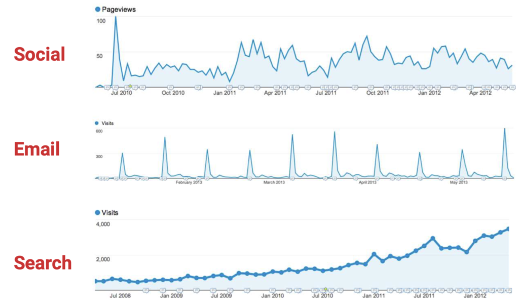 Na prática, as redes sociais são o esforço seu e do seu time diário, para criar conteúdos e lembrar que sua empresa existe. Mas na prática eles costumam andar de lado em acessos no seu site ao longo do tempo.