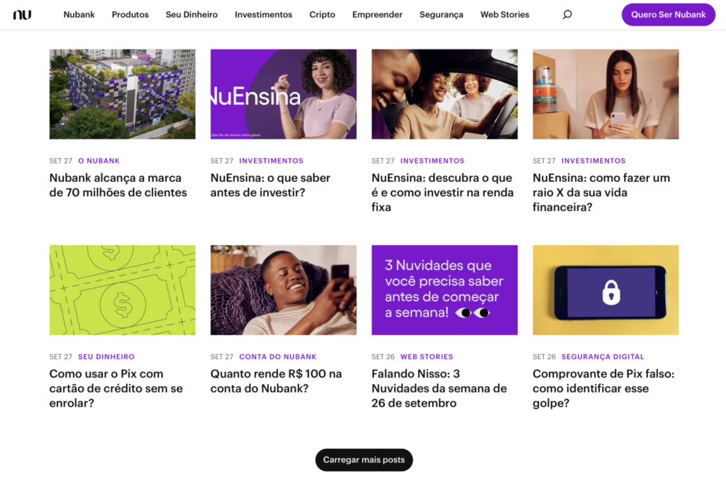 O Nubank não tem. Repare em quantos posts tem no blog deles por dia. Na data de hoje que estou escrevendo esse conteúdo foram 6. 👇