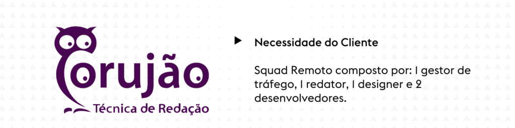 A empresa Corujão Técnica de Redação precisava gerar leads e receita, de forma rápida. Em conversa com o seu fundador, Roberto Mattos, entendemos que a melhor solução para o negócio seria um squad remoto composto por: 1 gestor de tráfego, 1 redator, 1 designer e 2 desenvolvedores.